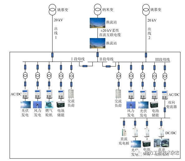5.2 国内典型工程国家电网公司在直流供电技术研究的基础上,开展了苏州工业园区主动配电网应用示范区的建设,其中基于柔性直流互联的交直流混合主动配电网技术应用示范工程由±20KV柔性直流互联系统和分布式光伏、分布式风电、微型燃气轮机、蓄电池、电动汽车充换电负荷、用户侧分布式储能、直流微电网等可控单元组成,总体架构见图3。