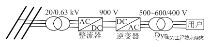 芬兰Elenia Oy公司设计的交直流配电网典型 结构见图2。该典型结构从中压交流20 KV线路上引出分支线,先通过20/0.63 KV配电变压器降压到低压交流0.63 KV,并经过整流换流器升压到低压直流900 V,再通过低压直流900V配电线路输送给用户,在用户侧经过逆变换流器转换成低压交流500~600V,再通过500~600/400V低压隔离变压器输出交流400V为终端用户供电。
