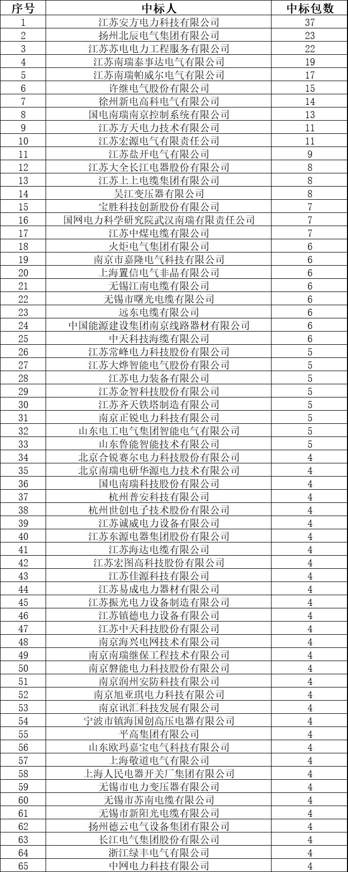 江苏苏电电力工程服务有限公司中标22个包,排在第三位,中标物资有蓄电池组、中央空调系统、精密空调、防鸟设备、电视电话系统和零散物资等等。