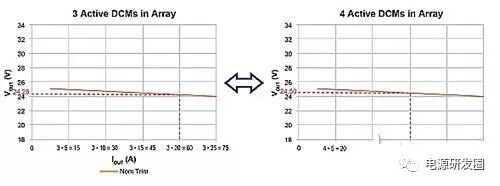 尽管如此,虽然这种负载线输出特性允许多个DCM输出直接进行并联,但是它们自身的误差放大器控制回路仍处于活动状态。如果所有的DCM对负载都有相同的外部(真正的)路径电阻,有相同的调节设定值,并且都处于相同温度,阵列中的DCM上的负载电流分布是完全相等的。因此,并联DCM的行为就像单个DCM,但是有更高的输出电流(图4)。