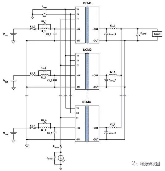 由于其负电压温度系数,利用DCM转换器系列,各自单元中的温度变化不是问题。如果一个电源的加载比其他电源多,相对于其他电源其温度会上升,这反过来会导致其输出电压降低。由于其他并联DCM的输出电压与加载DCM的输出电压相匹配,其输出将跟随其负载线,从而增加其负载电流的共享,使电路回到平衡。