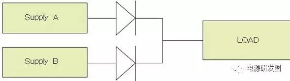 图2:原则上可以通过使用二极管组合多个直流电源输出来隔离一个电源与另一个电源,但这种配置有很多有关负载平衡和均流的性能问题。
