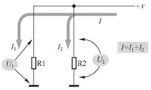如图,流过电阻R1的电流I1,流过电阻R2的电流是I2,并联电路的总电流I,从电源+V流出的电流分成两路,一路流过R1,另一路流过电阻R2,各支路电流之和等于回路中的总电流,对这一具体电路来说,是I=I1+I2。如果有更多的并联支路,便有I=I1+I2+I3......在并联电路的个支路中,支路中的电流大小与该支路中的电阻器阻值大小成反比关系,阻值大的电阻器之在电路中电流小,相反,阻值小的电阻器在电路中的电流大。