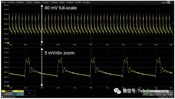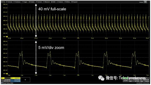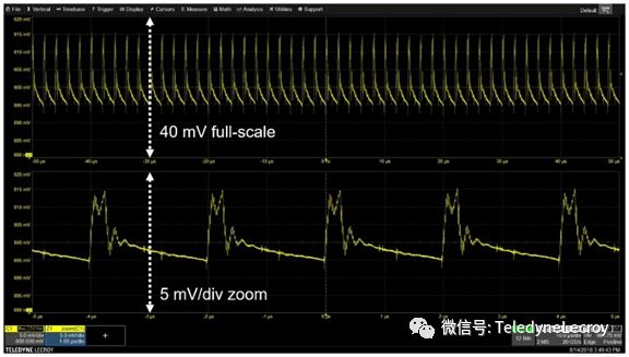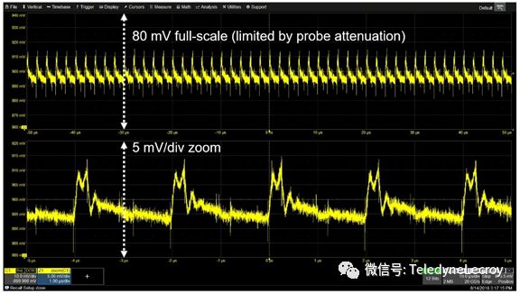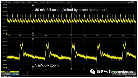 最后,第五种选择是电源轨探头,专门用于探测电源轨(如力科RP4030有源电源轨探头),该探头提供4 GHz的高带宽,低噪声,仅1.2倍的衰减以及±30 V DC的高偏置能力。当使用RP4030电源轨探头测量900 mV电源轨时,探头的1:1衰减实现了更低的噪声,而高达30 V的大DC偏置范围则足以胜任当前的工作(图5), 它还在DC上呈现50kΩ的负载,这意味着不会从低阻抗电源轨上汲取大量电流。图5:专门为探测电源轨而设计的RP4030电压轨探头具有低噪声,大DC偏置范围,并且不会从低阻抗电源轨汲取电流