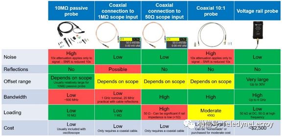 一般而言,使用高精度示波器测试电源噪声有五种方式(表1):
