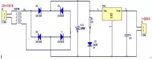 该电路输入家用220v交流电,经过全桥整流,稳压后输出稳定的5v直流电。
