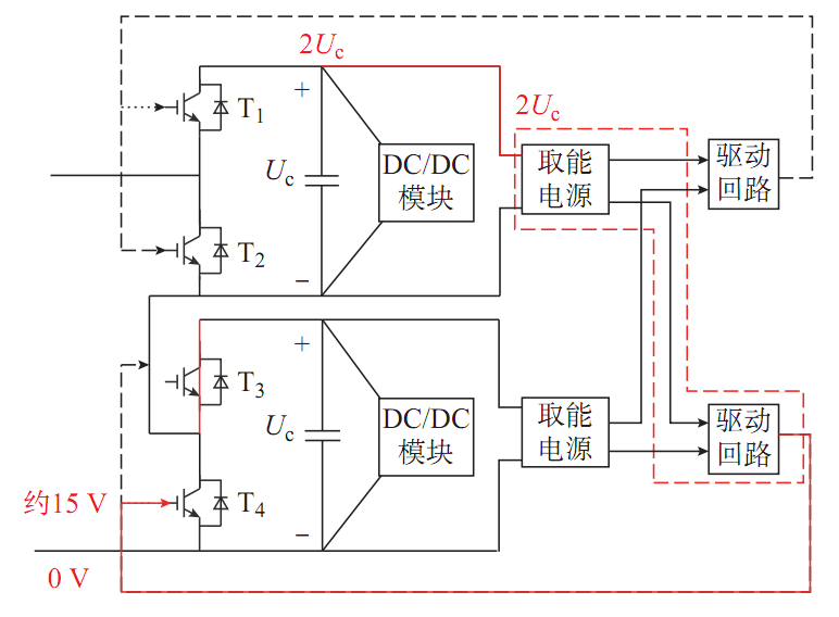 对于DCT这类模块数量较少、冗余度小的情况可采用如图2所示的交叉冗余取电技术解决黑模块问题,高低压侧分别通过本模块及相邻模块的取能电源实现对驱动电路的冗余供电。应当指出,此时图中红色虚框部分需承受约2倍模块电压。