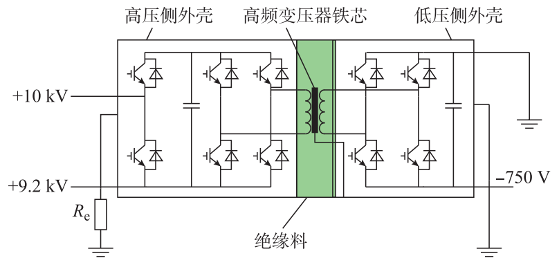 若子模块采用金属外壳,则高频变铁芯可接地,高低压侧外壳间绝缘按10 kV直流设备设计,高频变高压绕组对地、高低压绕组间绝缘按10 kV直流设备设计,低压绕组绝缘按普通低压设备设计。