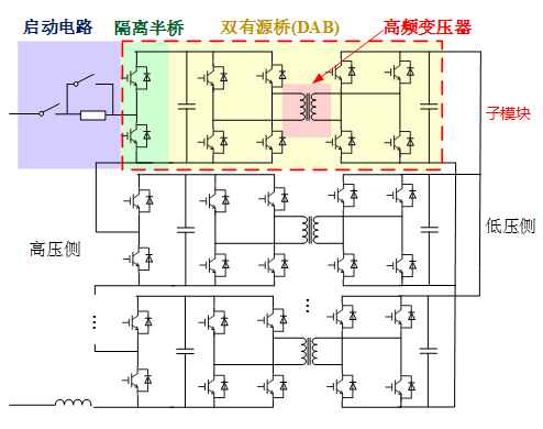 对于纯光伏接入场景,其特征在于功率由低压侧单向流向高压侧,可在高压侧选用高耐压水平的二极管代替绝缘栅双极型晶体管(IGBT)模块,从而减少模块数目,降低设备尺寸。